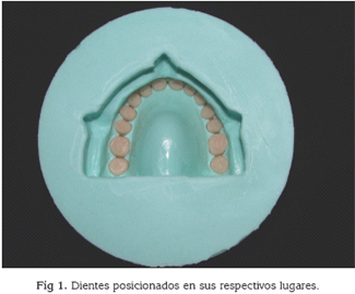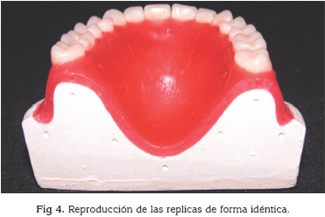Esta técnica permitió la reproducción de 36 prótesis totales superiores enceradas de forma idéntica (Figura 4), que fueran divididas en 6 grupos de seis réplicas cada uno: