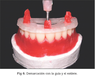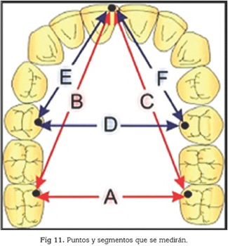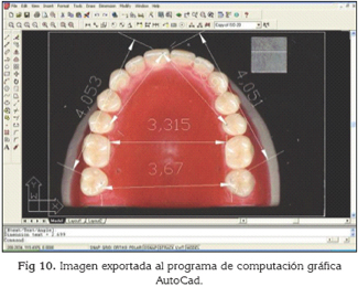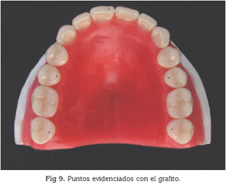De modo que estos puntos fueron repetidos de igual manera en todas las réplicas fue construida una guía de resina acrílica incolora sobre las superficies dentales de la prótesis seleccionada, perforada en los puntos demarcados, lo que permitió reproducirlos en las otras 35 prótesis (Figura 8). Los puntos marcados fueron cubiertos con grafito para tornarse aún más evidentes (Figura 9). Para conseguir las medidas entre los puntos; las prótesis en cera fueron digitalizadas (Scan jet 6100C - Hewlett-Packard) junto con un bloque metálico de 1 × 1 cm permitiendo que el programa fije los verdaderos valores, favoreciendo el redimensionamiento de los modelos. Posteriormente a la digitalización de cada prótesis, (Figura 10), las imágenes fueron exportadas al programa AutoCad 2000, para medir las distancias entre los puntos (Figura 11), dando valores a los segmentos. Después de la polimerización, toda la operación fue repetida.