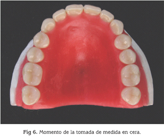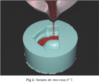 En un modelo edéntulo superior fueron enfilados los dientes artificiales (2D- 32M Vipi Plus - VIPI Dental Ltda.) con la ayuda de un articulador semiajustable, teniendo como modelo antagonista el modelo inferior correspondiente. La prótesis total superior, aún en cera, fue moldada con la silicona, permitiendo su reproducción con los dientes posicionados, en sus respectivos lugares (Figura 1). A seguir, se realizó el vaciado de cera rosa nº 7 fundida (Figura 2), y se adaptó el modelo previamente confeccionado (Figura 3). Después de la solidificación de la cera, la prótesis (diente + cera + modelo) fue retirada.