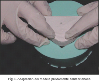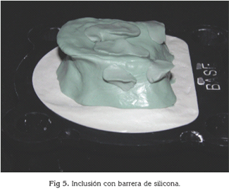 En la inclusión con yeso, toda la base de la prótesis, incluyendo los dientes fueron cubiertos con yeso tipo III y en la inclusión con silicona, la base de la prótesis y los dientes fueron cubiertos con este material (Figura 5) y el restante con yeso tipo III.
