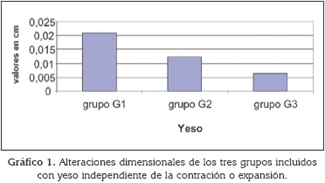 La tabla 1, muestra los valores promedios de las medidas de todos los segmentos de las réplicas en la fase de encerado y en la fase de polimerización de los grupos incluidos con yeso, siendo el grupo G1, en el cual fue utilizado la presión media de 800 kgf, Grupo G2, presión de 1.000 kgf y grupo G3, presión de 1.250 kgf.