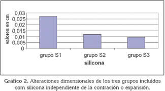 En la tabla 2 se muestran los valores promedios de las medidas de los segmentos de las réplicas de los grupos S1, S2 y S3, que fueron incluidos con la barrera de silicona con las presiones de 800, 1.000 y 1.250 kgf, respectivamente.