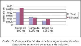 4. Los grupos que recibieron presión de 1.000 kgf (yeso y silicona) presentaron valores de alteración muy cercanos.
